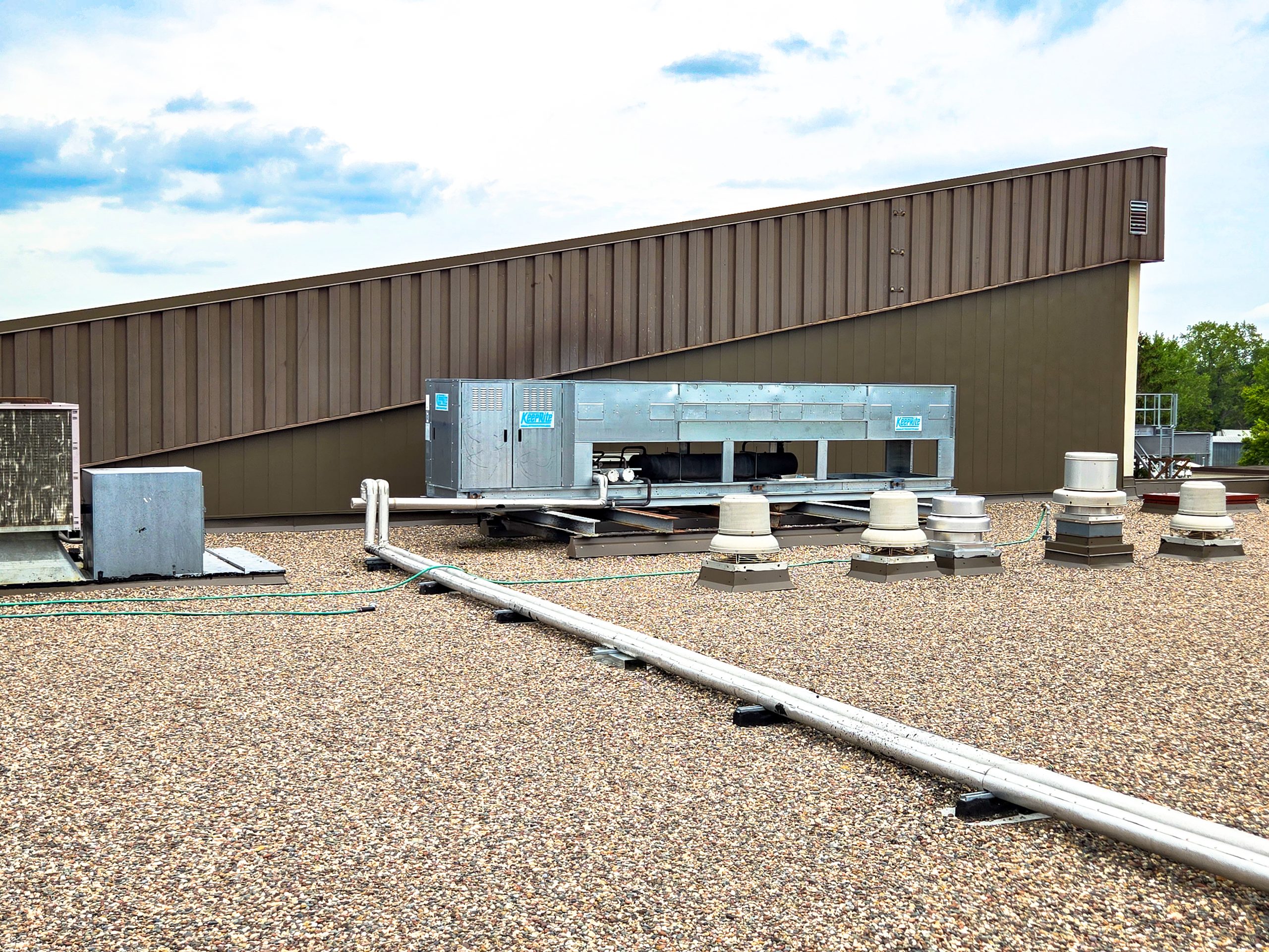 For the roof sections over ice rinks, Schwickert’s installed a multi-layer Garland BUR system. This included two plies, topped with a modified field membrane, modified flashing membrane, and finished with a flood coat and gravel surfacing—all installed with hot asphalt.